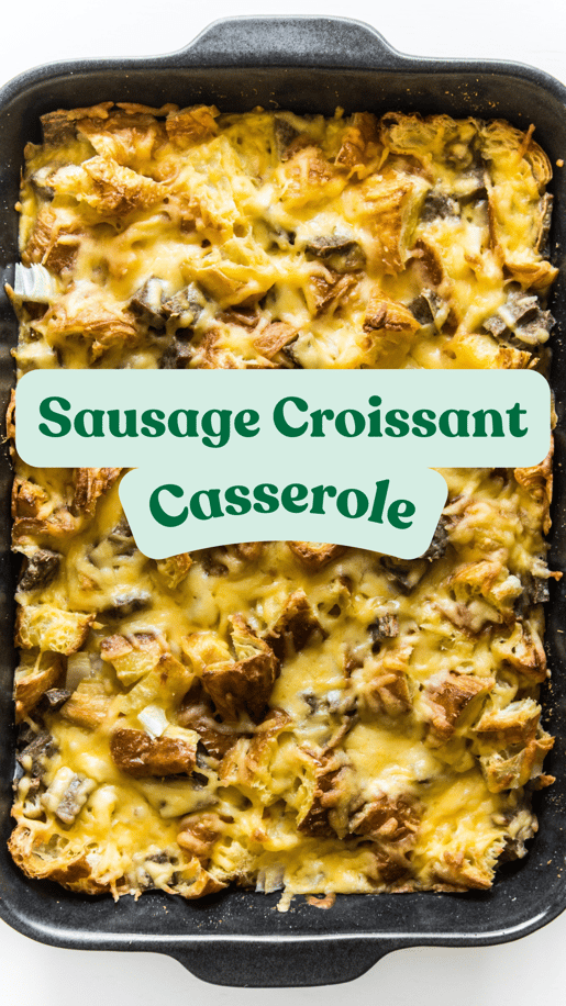 Cut the softened frozen sausage into bite-sized pieces. Place croissant pieces, onions and diced sausage into a large, greased baking dish. Toss to combine. Evenly distribute parmesan cheese over the bread mixture and shake the baking dish to distribute the cheese.