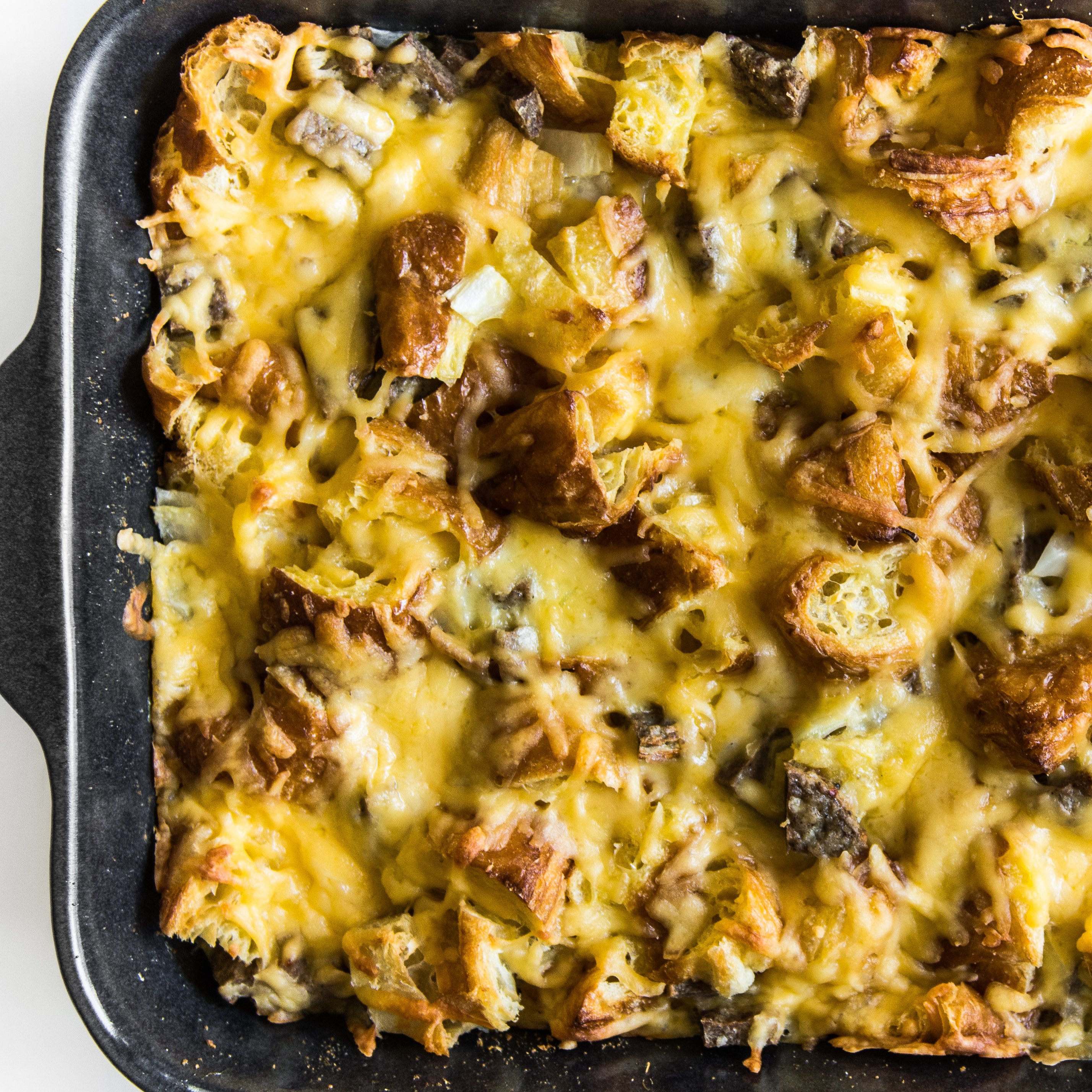 Whisk eggs to combine again and pour over the bread mixture. Using your hands or a spatula, press down on the bread mixture to condense. Top with gouda and fresh pepper to taste. Place into the oven and bake until set, about 45 minutes. Check the casserole after 30 minutes. If the croissants begin to burn, cover with foil to prevent burning.