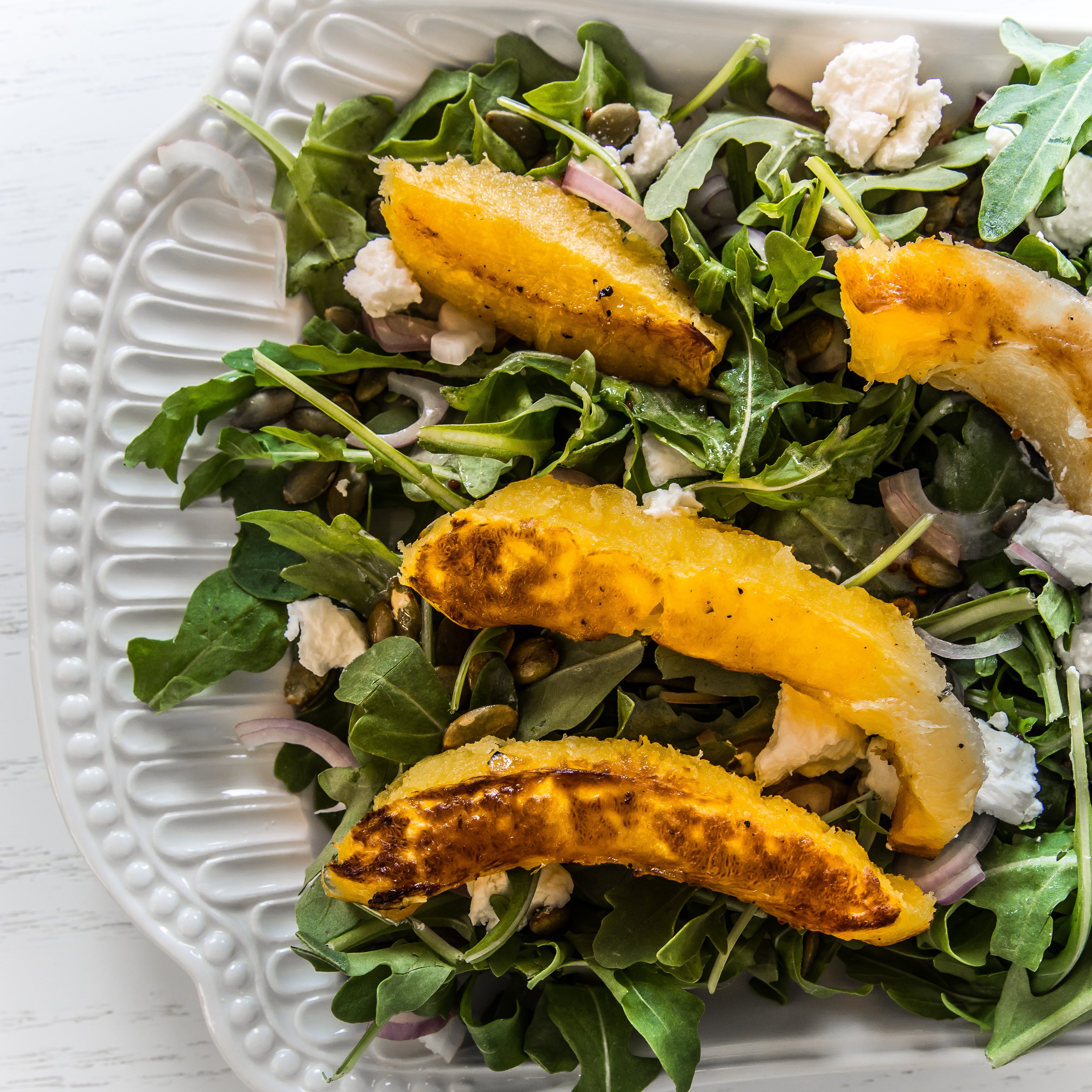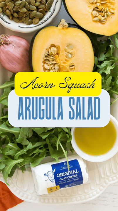 Place the arugula onto a long serving platter. Add the shallots, pepitas and goat cheese. Drizzle with vinaigrette. Top with the acorn slices. Serve immediately.