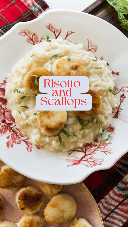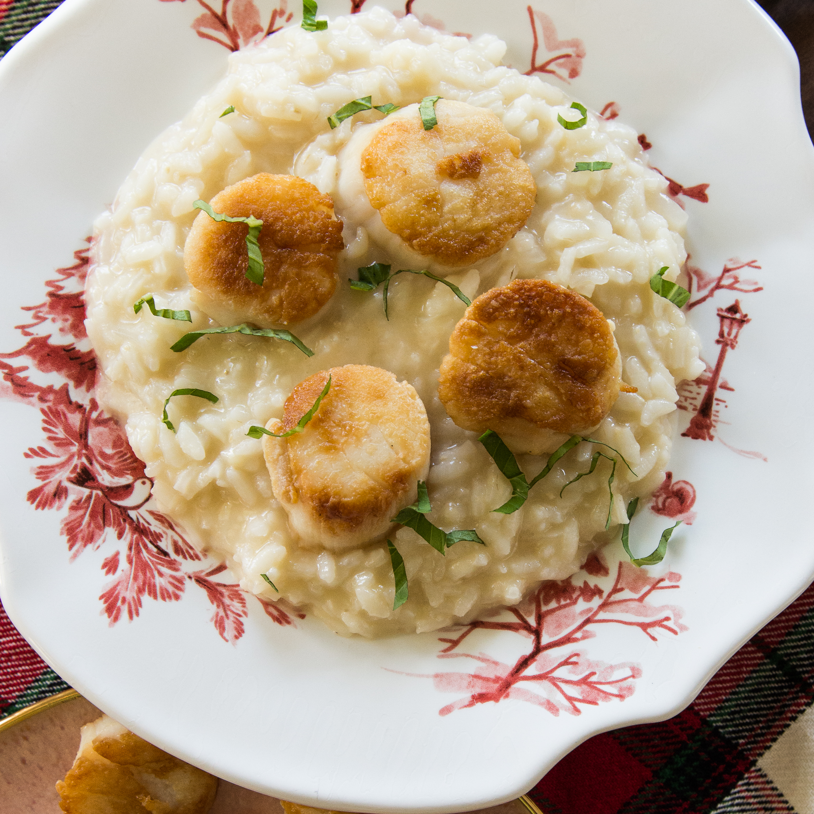 Top the scallops with fresh lemon juice. Place on top of the risotto and serve warm.